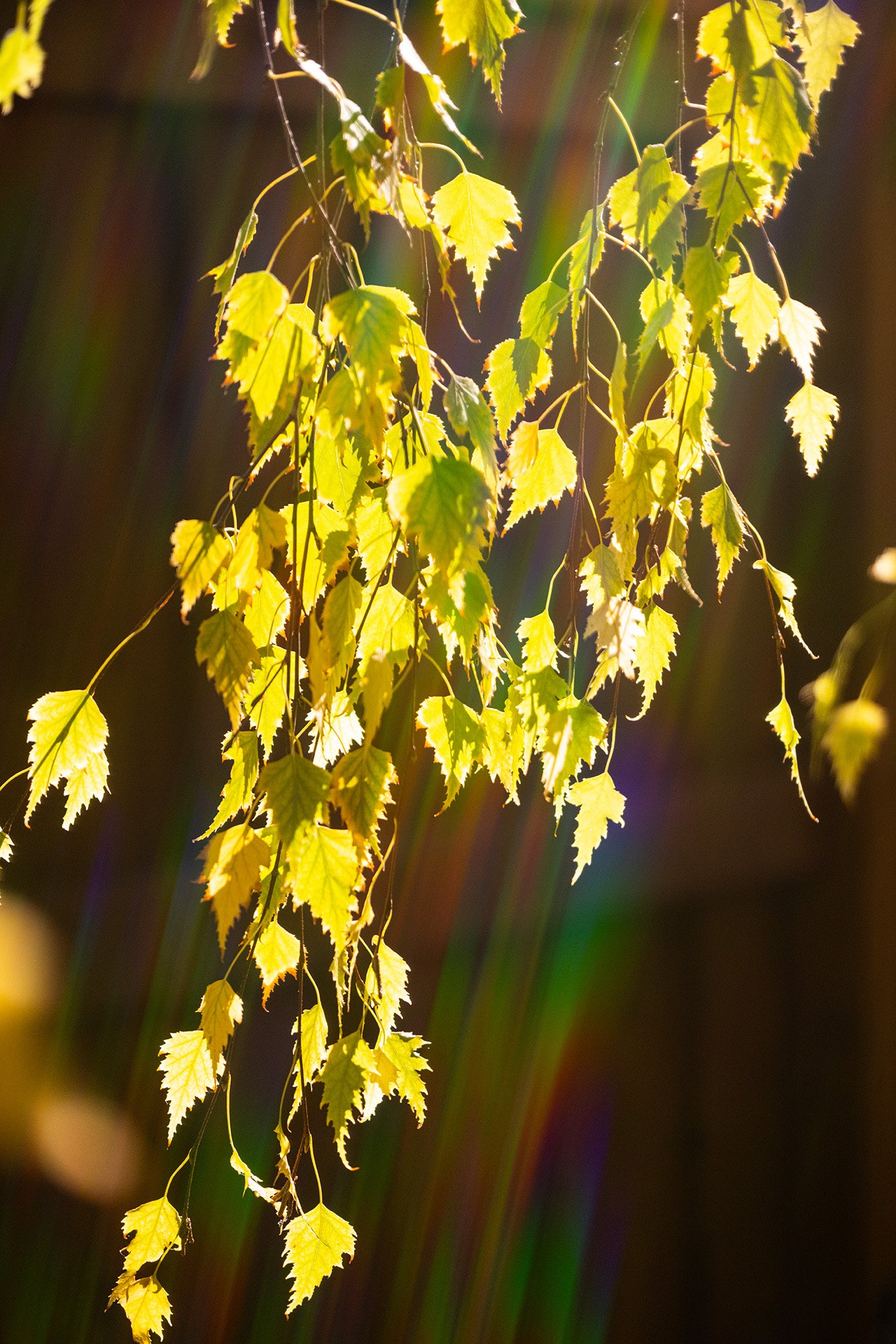 Here is an example of foreground and background bokeh control. I used my 100 mm Macro lens at about a meter distance from the subject. This lens has a natural shallow depth of field, so the dark brown fence is reasonably out-of-focus while the leaves are tack sharp. By holding a plastic sheet very close to the lens I got this rainbow bokeh effect. f/2.8, 1/8000 sec, ISO 1000.
