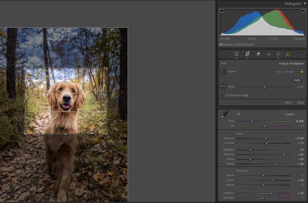 Here are my settings. This is a crop from a larger photo but with the 35mm lens you have to get close. My edits are shown on the right. Dog treats were the motivator to keep her interested.