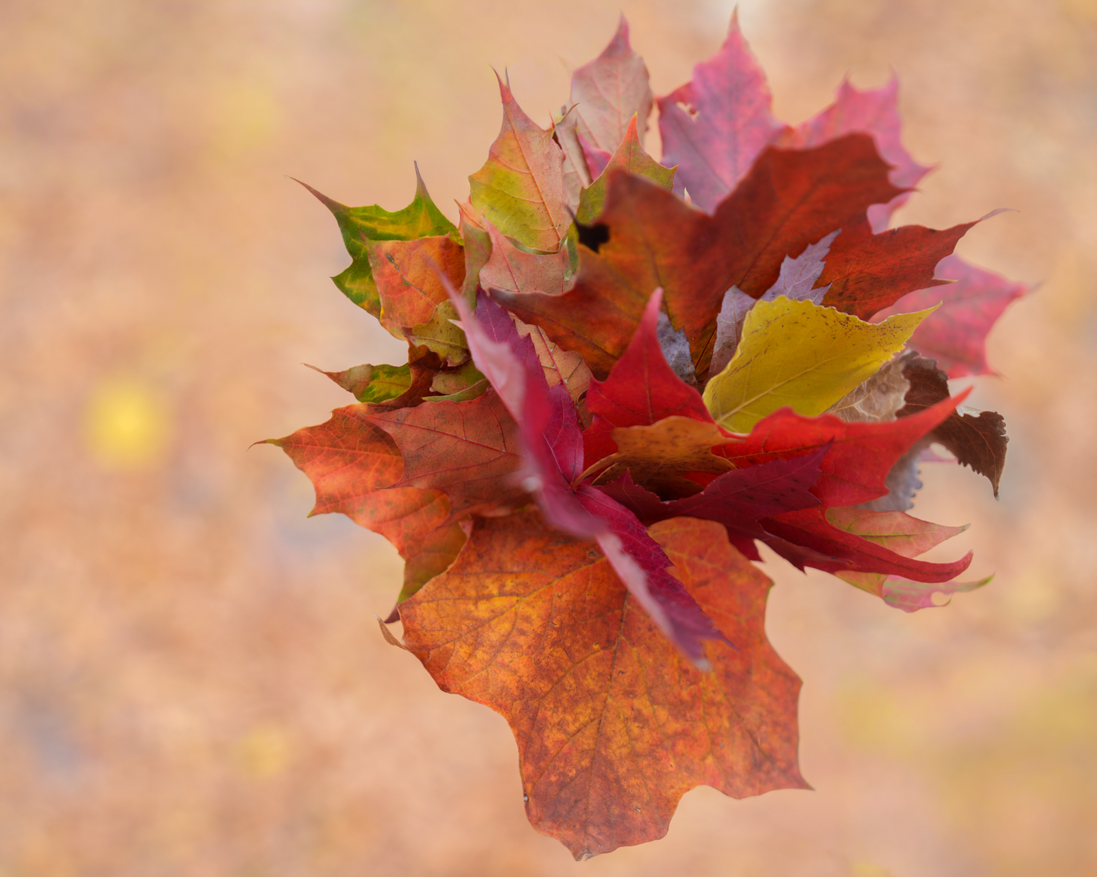 While visiting family in Ottawa where there is a wider variety of autumn colours, I was asked to take a photograph of my grand-daughter’s bouquet of leaves. I asked her to hold them over the fallen golden and rust coloured leaves on the ground, This is her bouquet with a soft bokeh behind it. I used AI removal to take her arm out of the picture. I used an aperture of 2.8 which took away any details amongst the fallen leaves. ISO as a result was low at 250 and I used 1/400 and advised my little granddaughter to hold the leaves still…which she did.