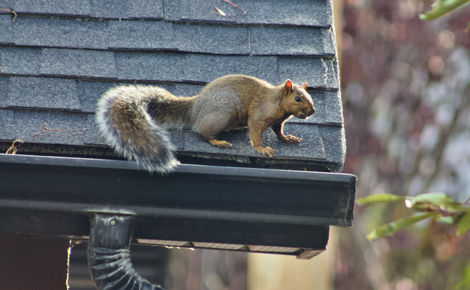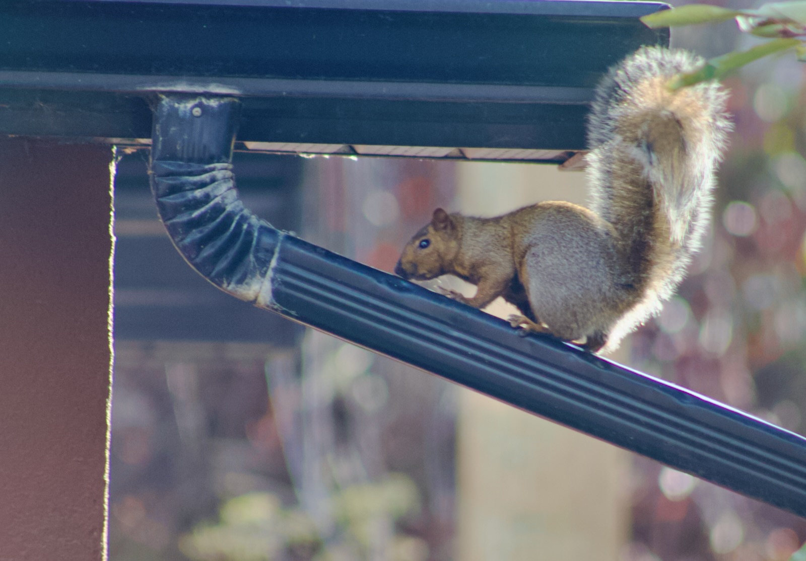 Squirrel looking to raid the bird feeder. ISO 400, f/5.6, 1/400