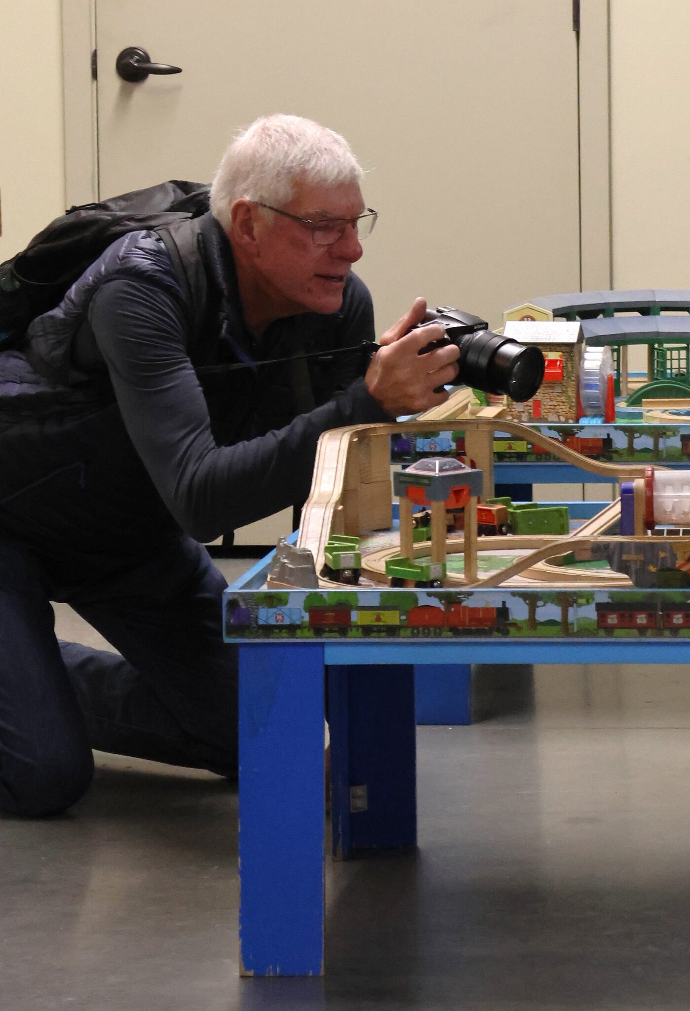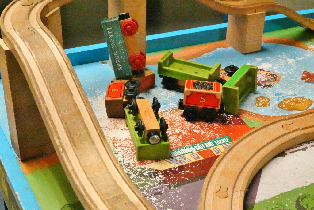 There was a wooden train set on the bottom floor. The jumble of toy train cars caught my eye.