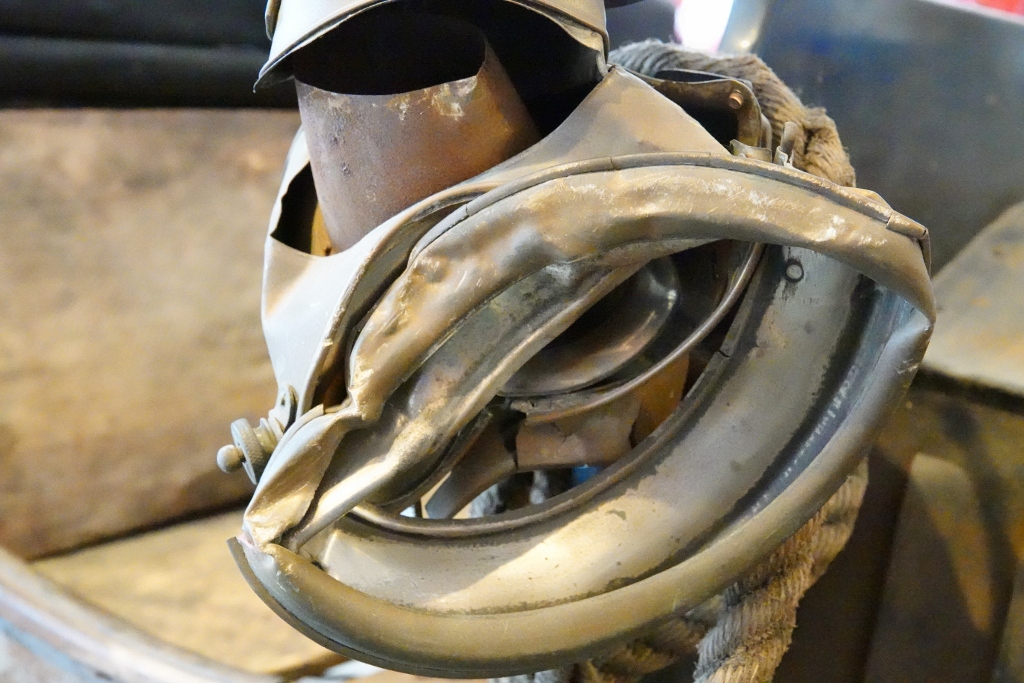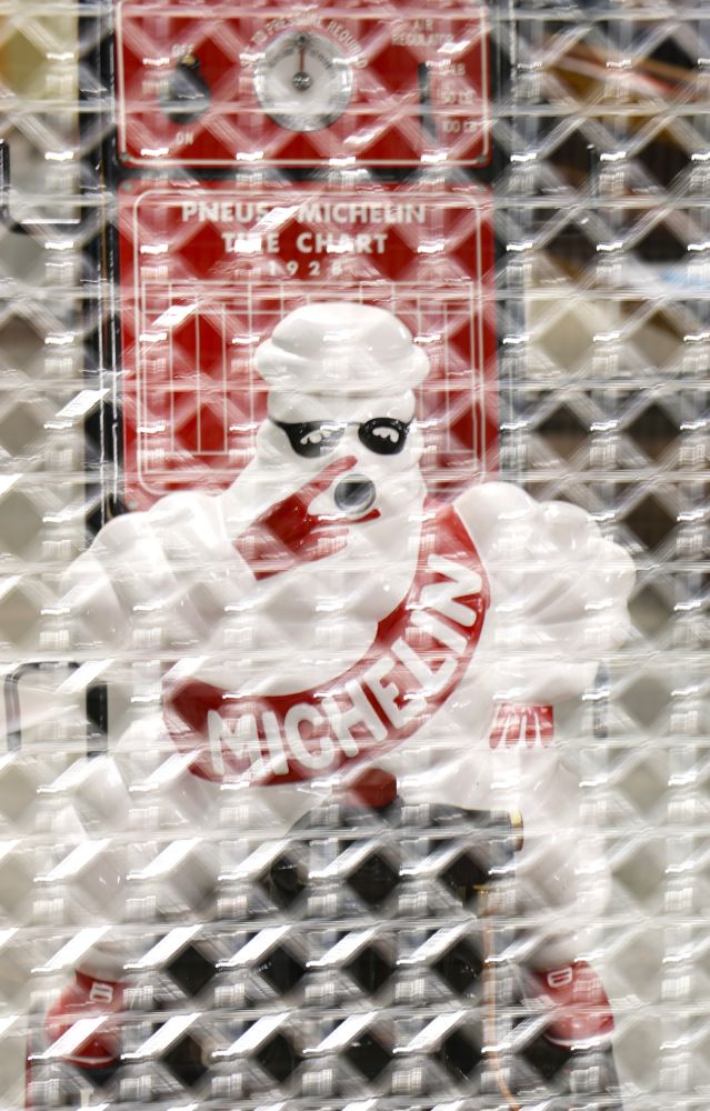 Double exposure. The Michelan man on the air pump with the inlay of the grill of the car next door.