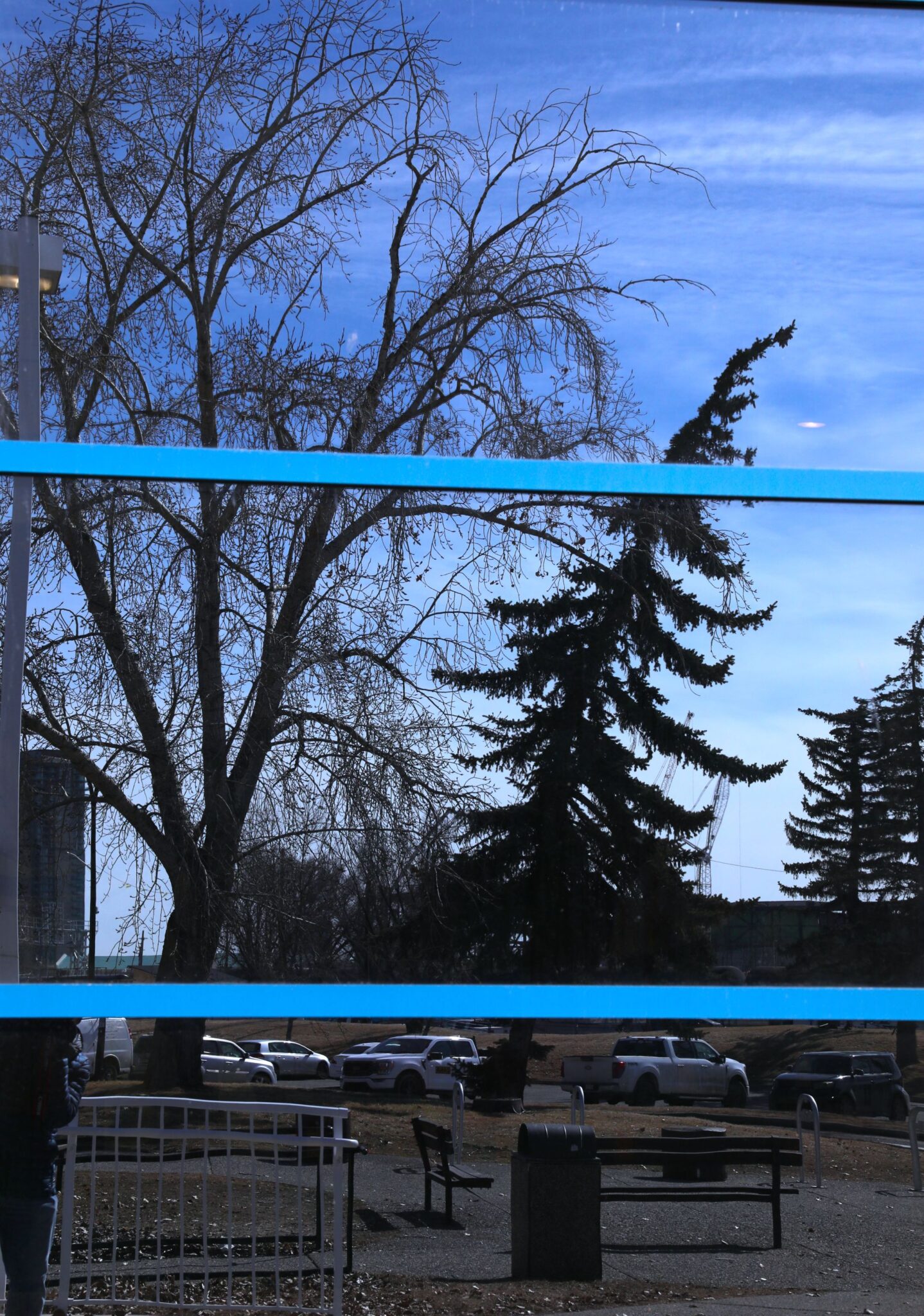Trees reflected on window panes